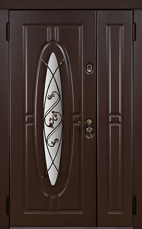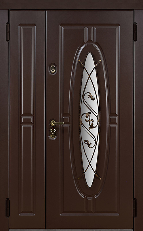 Двойная уличная дверь с овальным стеклом и художественной ковкой №14 — это уникальное сочетание функциональности и эстетики. Панели МДФ с ПВХ-покрытием, используемые как для внешней, так и для внутренней отделки, обладают высокой стойкостью к внешним воздействиям, сохраняя свой внешний вид на долгие годы. Внешний декор в виде художественной ковки придаёт двери особый шарм, подчеркивая её стиль и индивидуальность. Двойная уличная дверь с овальным стеклом и художественной ковкой №14 от производителя: быстрое изготовление и монтаж в Раменском, индивидуальные размеры, широкий выбор материалов и фурнитуры, официальная гарантия до 10 лет.